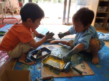 絵の具が手につくのが嫌だったり,どんなものかなと不安に思ったりする子どもも,手を拭けるようなタオルがあるのを見て安心したり,昨日友達が絵の具遊びをしていた姿を見たりして気持ちが動いたのか,「やってみる!」と絵の具遊びを楽しみました。