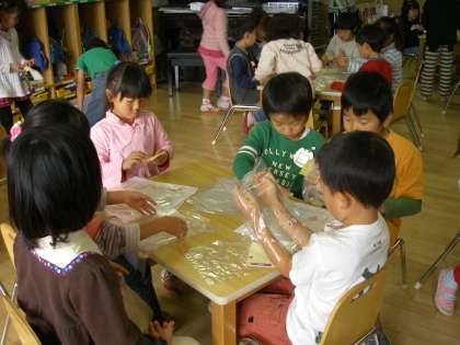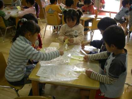 「出来上がったポップコーンを入れる袋をつくろう」ということで,ゆり組の子どもたちが自分の分もそして1年生のお兄さん・お姉さんの分も作りました。