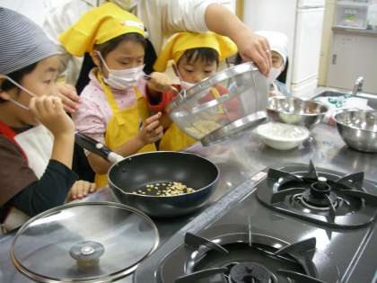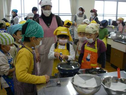 さあいよいよ調理の開始です。家庭科室には,小学校のお母さん先生,地域の先生,幼稚園の食育班のお母さん先生が,それぞれのテーブルで子どもたちのお手伝いをしてくださいました。フライパンにポップコーンの種をスプーンで2杯,そしてサラダオイルを入れ,塩を6フリ入れて火にかけました。透明のふたなので中の様子がよく見えます。順番にガスの上でフライパンをゆすっていきました。その内にポンポンといい音がして,はじけ始めました。全部はじけるといい匂いが家庭科室にあふれました。フライパンのふたを押し開けそうになっているグループもありました。