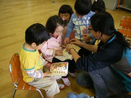 今日も先生やお友達と一緒に「どのシールを貼ろうかな」ってシール貼りを楽しんだりしかけ絵本を楽しみながら,お母さんが来てくださるのを楽しみに待っているこどもたちでした。