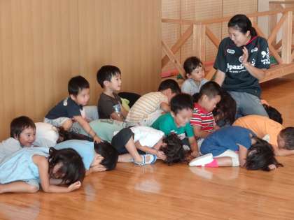 今日は担任の先生が“かいじゅう”になって、広い遊戯室のすみで寝ています。子どもたちは“かいじゅう”に見つからないようにかくれています。