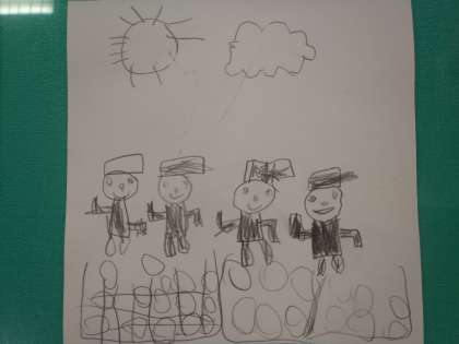 5歳児が“帽子取り”をして遊んでいる絵をかきました。