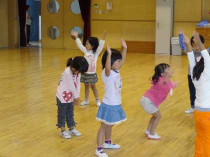 3歳児が体操をしたり、かけっこをしたりして今日も運動会ごっこを楽しんでいます。
