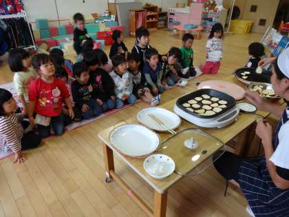 今日は3歳児のもも組の子どもたちがさつまいもをホットプレートで焼きました。