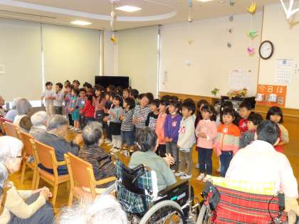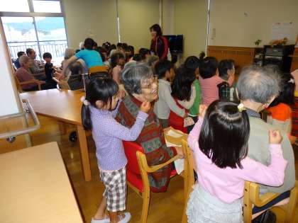 始めは緊張もあり、子どもたちの表情もすこし、硬かったのですが、おじいちゃん・おばあちゃんのにこやかな表情と拍手に、支えられ、だんだん元気な歌声になっていきました。