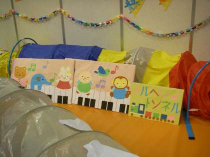 来場者が遊んだり,作って遊んだり出来るようにと京都市立幼稚園PTA連絡協議会が担当するブースがあります。みつば幼稚園は,他の幼稚園と遊ぶコーナー「トンネル」を担当することになりました。そしてその「トンネル」のテーマが「メルヘン」ということになり,アート班・トンネル班の方が「メルヘン」をテーマにトンネルの飾りを考えて作ってくださいました。本当に可愛い飾りができました。