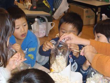家庭科室でつくったポップコーンを、
