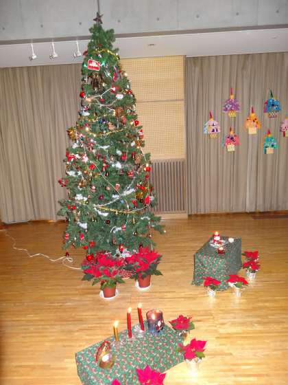 遊戯室はきれいなツリーや飾りがあり、夜のように暗くして、ろうそくの明かりもともっています。