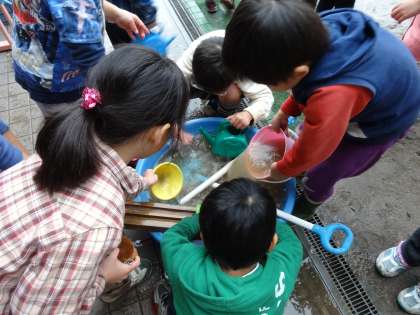 子どもたちはスコップやお皿についた砂や泥を丁寧に洗っていました。