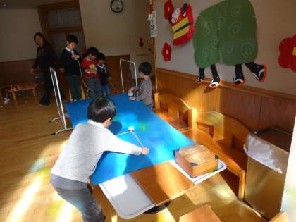 3学期の始業式で、3歳児・4歳児・5歳児のそれぞれがお年玉として園長先生から「こま」をいただきました。