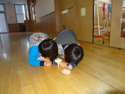 3歳児はくるくる回るこまを友達と一緒に顔を近づけてみています。