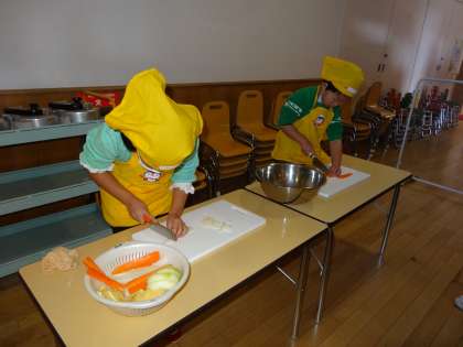 大きな大根だったので、子どもたちが野菜を切りやすいように、PTAのお母さんに手伝っていただき下ごしらえをしました。
