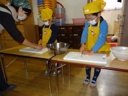 16日、今日は5歳児の2つのグループの子どもたちが、お味噌汁の野菜を切る調理体験をしました。