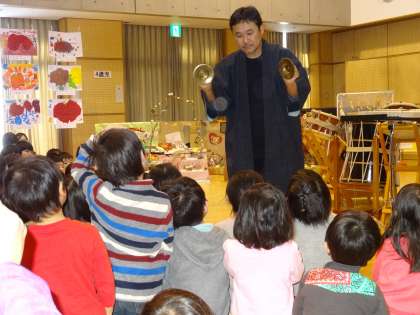 5種類の様々な和太鼓の音をみんなで耳を澄まして「どんな音がするかな?」と聴きました。