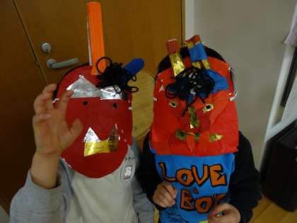 節分が近づき、子どもたちが鬼の面をつくっています。