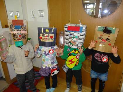 できあがったお面をかぶって早速、園内のあちらこちらを歩いています。