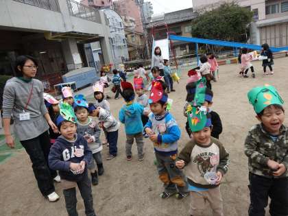 子どもたちは自分たちがつくった鬼の面をかぶって園庭にでてきました。