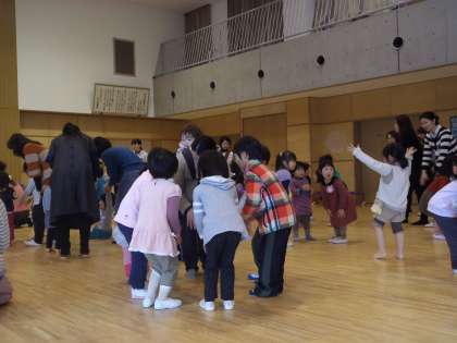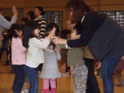その後、4月から年長児になるばら組・すみれ組の子どもたちと一緒に♪「がっちりガード」を踊ったり、♪「よろしくね!」など仲良し遊びをしました。絵本も一緒に見ましたね。