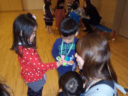 そして、ばら組・すみれ組の子どもたちからプレゼントも渡しました。手づくりの首飾りです。