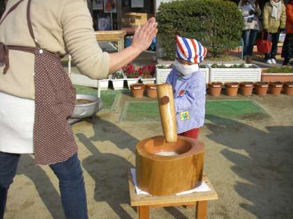 初めておもちをつく人もいたことでしょう。でも見よう見まねでみんながんばっていました。