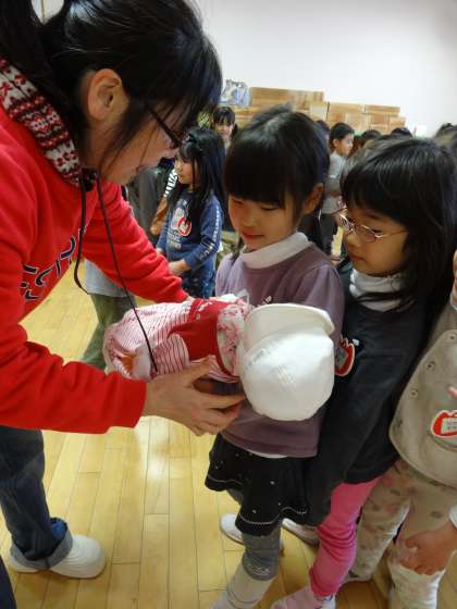 赤ちゃんのときの背の高さや体の重さを実感できる赤ちゃん人形を抱っこしてみました。