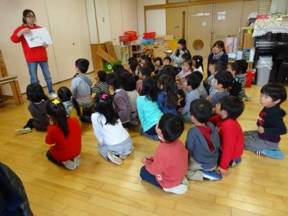 紙芝居で、なぜ、早寝早起きが良いのか、大きくなるためのヒミツを教えていただきました。