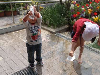年少組の保育室の前では,ビニール袋に穴をあけて,シャワーにして水遊び。