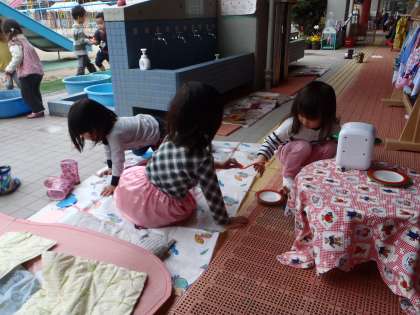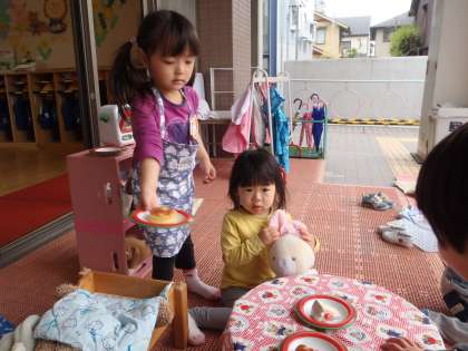 ごちそうをつくったり,ぬいぐるみを抱いて遊ぶのが大好きな年少組です。