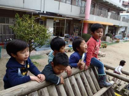こいのぼりの近くに行こうと,年中組の子どもたちとログハウスの上に登っていきます。