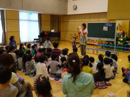 3歳児の子どもたちは、全園児が集まる会に参加するのは入園式以来です。