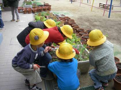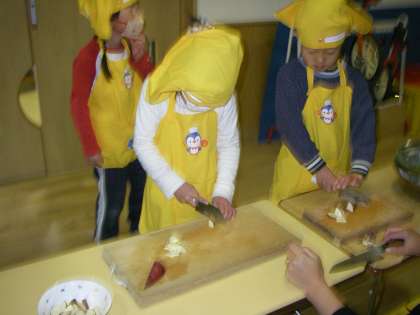 幼稚園に帰ってから,カブやネギを収穫し,さあ今度は包丁を使って料理をする番です。ニンジンはみんな手早く切ることができました。さつまいもは硬くて少し苦労をしていましたが,だんだんコツがつかめたようでした。硬いニンジンやさつまいもの感触とぬるっとするネギやワカメの感触の違いも感じていました。