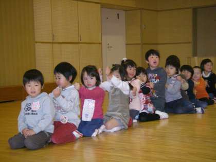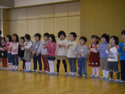 朝から興奮気味の子どもたち。まずみんなで歌を歌いました。きっと並んだらたくさんのお客様が本当に見えてびっくりしていたことでしょう。
