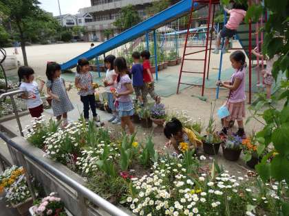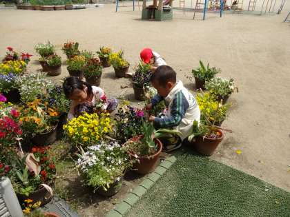 (いつもは園庭に咲くお花に水をやって大事に育てています。今日は、特別。そして、早いもので、春はどんどんすぎ、初夏を思わせる日々が続いています。そろそろ栽培物も夏の用意をしなければなりません。春のお花のおしまいに、花束をつくりました。さあ、次は夏野菜や夏のお花を植える土をつくりましょう! 来週が楽しみですね)
