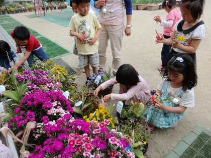 子どもたちが育てているビオラや、幼稚園の庭に咲いているパンジー、ナデシコなどを子どもたちが摘んでいます。
