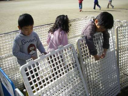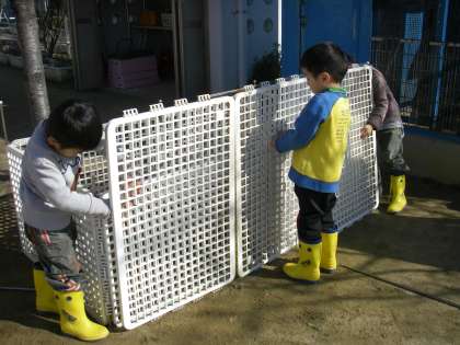 それぞれが考えられることを言い合っていました。一人が,「そうや。これを重ねたらどうやろ」と言いました。「うん,そうしよう」ということになり,今のゲージの柵の上にもう一枚柵をのせて棒でつなごうということになりました。