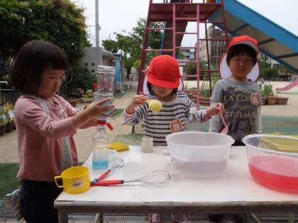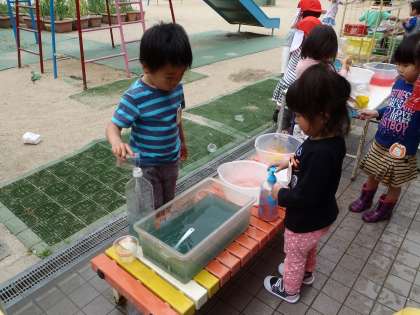 今までは,水だけで遊んでいたのですが,年中組さんがしている