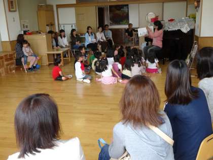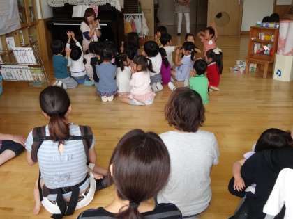 先生と一緒に手遊びをしたり、絵本を読んだりしている様子を参観していただいているところです。