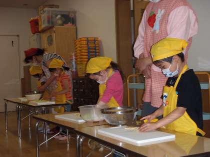 (子どもたちの調理体験をサポートするため、PTAのお母さんが来てくださいました。包丁の持ち方に気を付けてみてくださったり、「上手にできたね」とたくさんほめてくださったりして、子どもたちの活動を見守ってくださいました。ありがとうございました。)