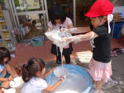4歳児が石鹸で泡をいっぱいつくって遊んでいます。