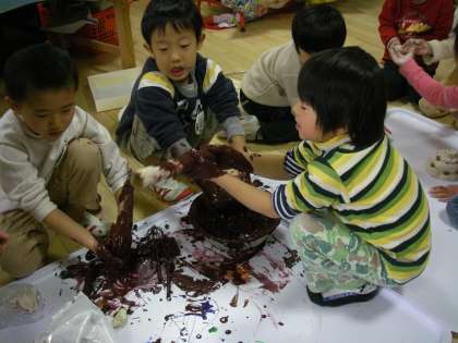 今での遊びの中でいろいろなものを作って遊んだ経験や材料経験,そしてスーパーやパンやさんでの買物経験など,点と点の経験がつながったのでしょう。次々アイデアがでてきたりして遊びを楽しんでいます。今度はどんなパンができるか楽しみです。