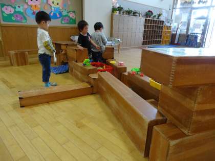 4歳児が玄関ホールで積木を使って遊んでいました。