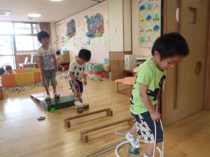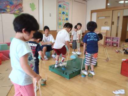 先日の休日参観に親子でつくった竹ぽっくりにのって、3歳児が遊んでいます。