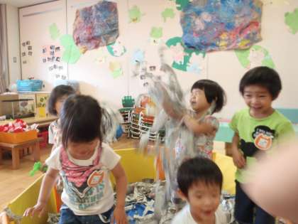 子どもたちは大喜びで、新聞紙を掛け合ったり、プールの中でくつろいだりしています。