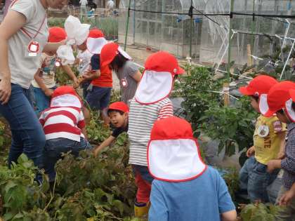 4歳児は進級して初めての畑でした。5歳児に手をつないでもらいバスに乗って行ってきました。帰りのバスでは疲れが出てウトウトと眠ったり、となりの友達とそっと手をつないでほっこりするなど、ほほえましい様子が見られました。