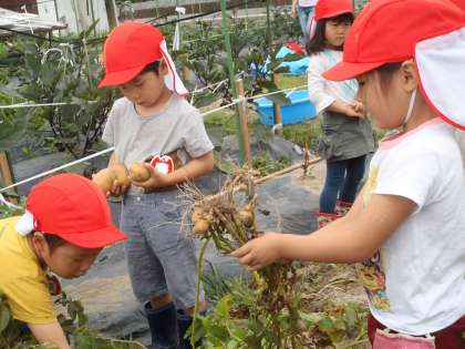 もう地面からジャガイモが顔をのぞかせているものもあり、子どもたちは「ジャガイモがここにある!」と茎を引っ張ったり地面を掘ったりして収穫しました。