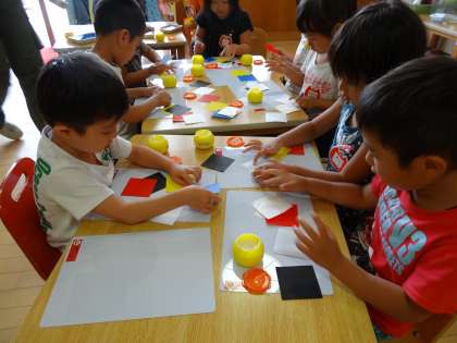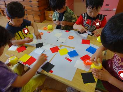 青・黄・赤・白・黒の色紙を並べてのりで貼っていきます。・・・五色紙です。