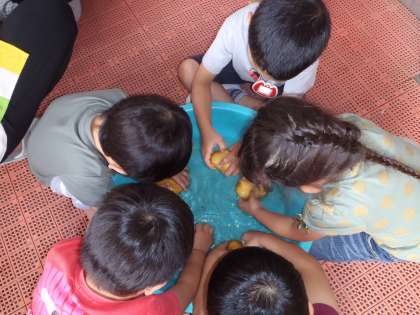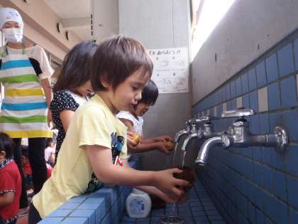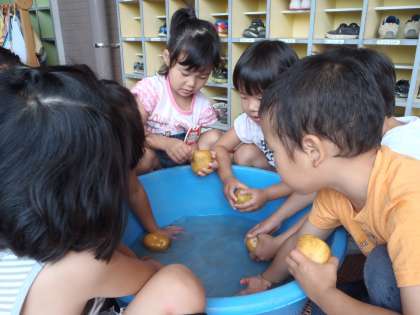 収穫した新じゃがはたわしでこすって皮をめくったり、爪でがりがりしたりしてきれいにしていきます。