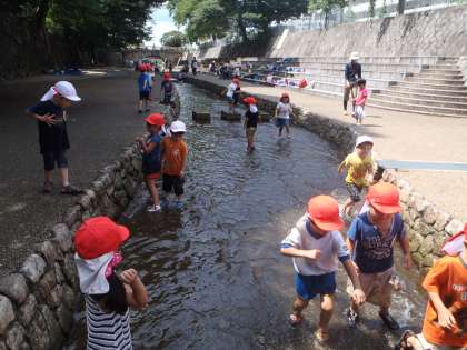 堀川まで遠足に行き,川遊びをしました。