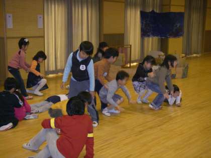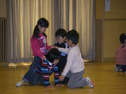 ゆり組のパン屋さんもいっぱいいろいろな形のパンを友達と相談したり,考えたりして遊びました。パンになった子どもたちは,こねられたり,ねかされたり,焼きあがるまでを一生懸命がんばって表現していました。