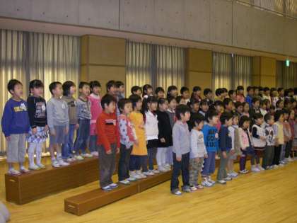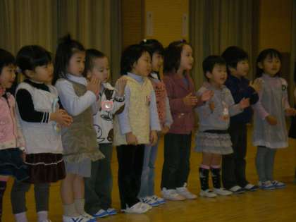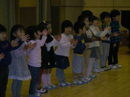 最初に全園児で歌を歌うときには,お兄さん・お姉さんたちと一緒ということで心強く思って歌っていたと思います。たんぽぽ組・もも組だけで歌う時には少し緊張していたかもしれません。でも一生懸命手遊びをする姿がとても微笑ましいでした。
